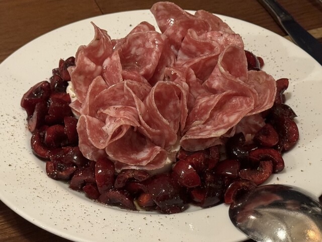 サラミとプーリア州ブラータチーズとりんごと根セロリのサラダからスタート。