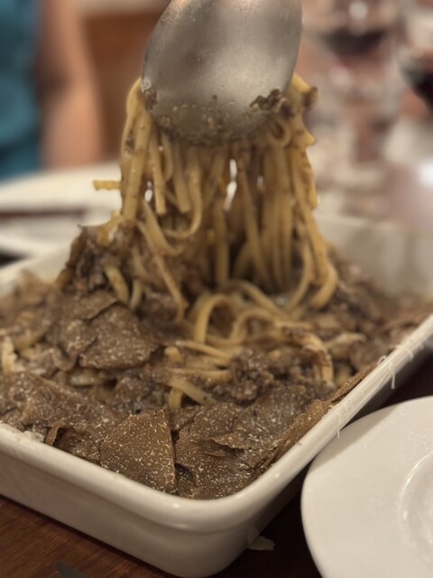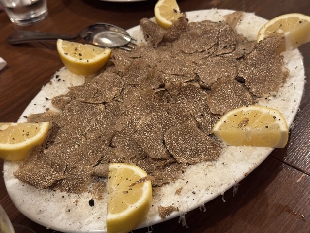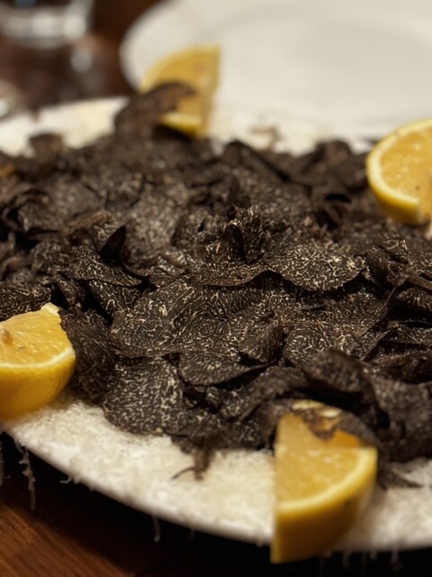 ウンブリア産黒トリュフをお肉が見えなくなるレベルまでたっぷり削ってある。