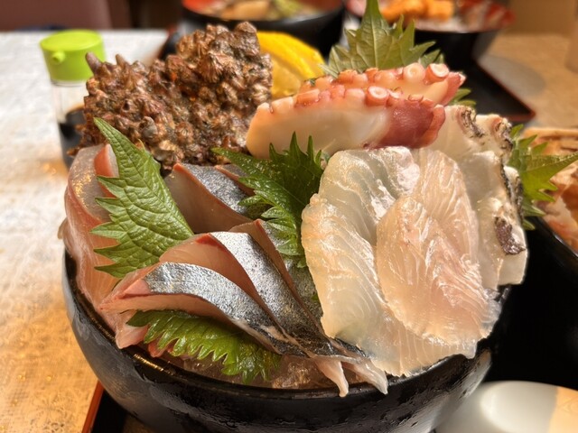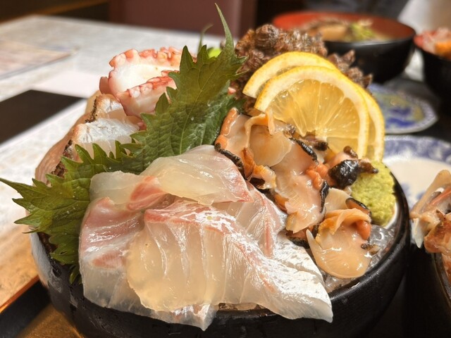 思わず一周まわして写真を撮ったほど、ふんだんに刺身が盛られている。種類はたい、しまあじ、ひらめ、はまち、たこ、さざえ。食感は弾力があり鮮度の高さがわかる。