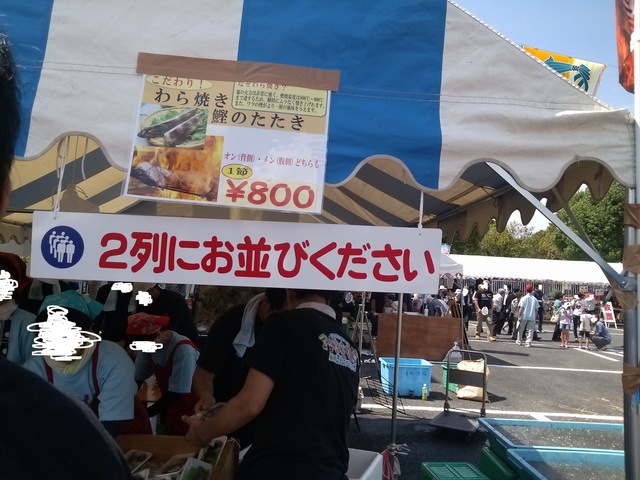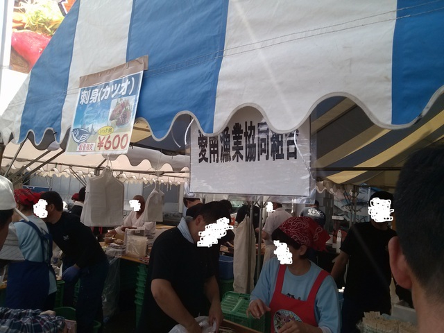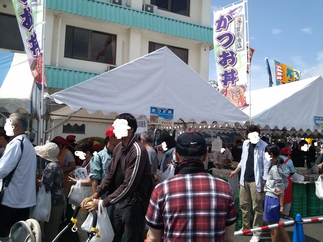 人気の鰹1本売りと鰹の刺身やタタキ販売テント前は長蛇の列をなしており