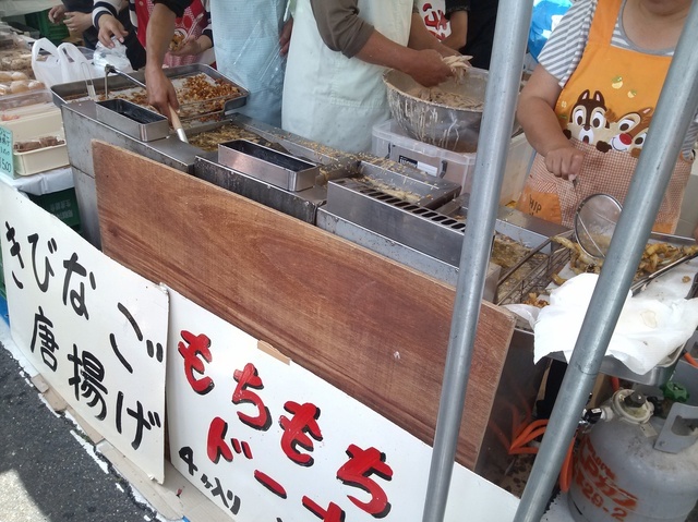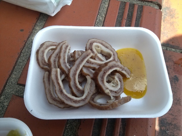 マグロ養殖をしている大学が出展しているテントで販売しており、腸をボイルして酢味噌で食べる。