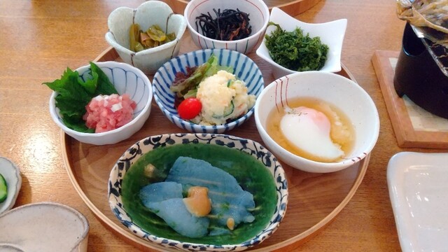 アジの干物をメインに、ひじき煮、ピーマンのお浸し、ポテトサラダ、ネギトロなど。