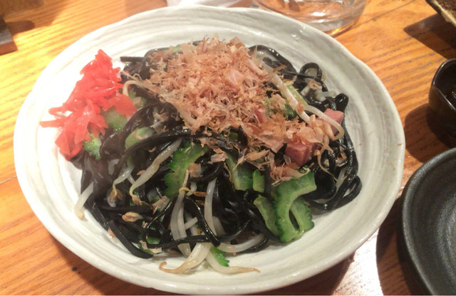 沖縄そばを使った焼きそばです、真っ黒な面に苦味抜きの下処理がしっかりされたゴーヤにスパム、豆もやし、鰹節、紅生姜が入ってます