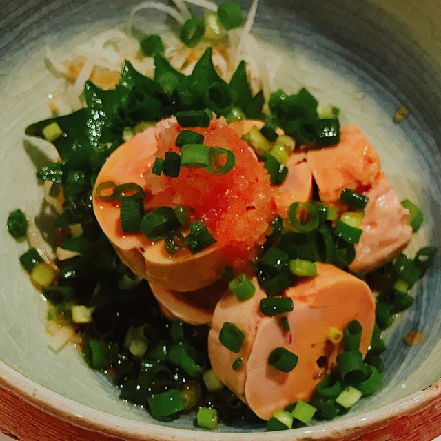熱した石がテーブルに置かれ、酒盗漬けになったとらふぐを自分で仕上げて食べることができます。