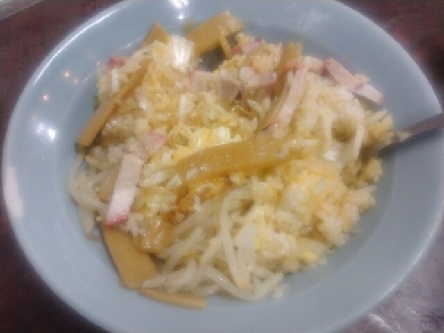 丼飯上にメンマ・焼豚細切り・モヤシ・薬味ネギ・目玉焼き。
