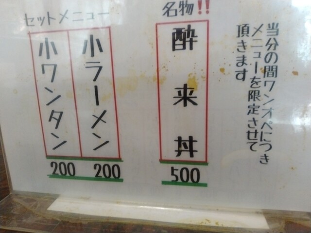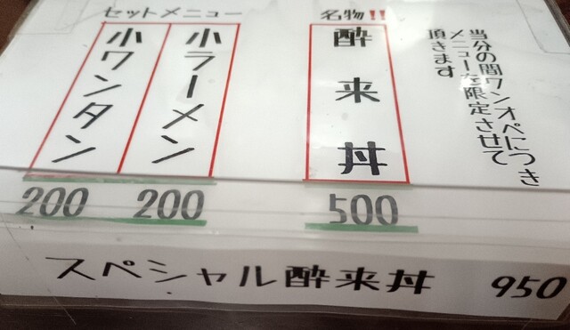 3.店のメニューは大幅縮小し、酔来丼中心らしい。