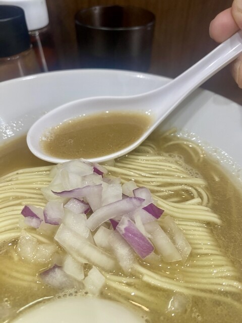 先ずはラーメン(煮干そば)のスープをスルリ、、
