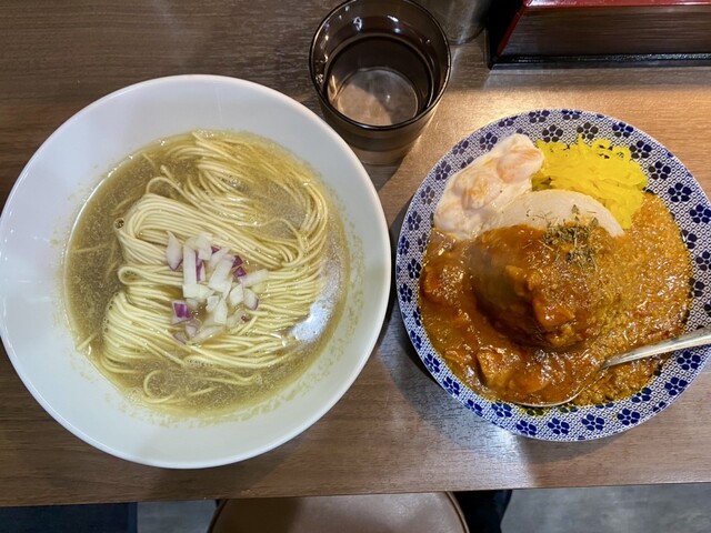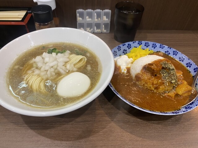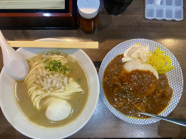 朝かけ(煮干しソバ)+本日のカレー(ポークカレー)