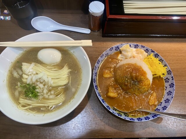 煮干しソバ(かけ)+本日のカレー(ポークカレー)