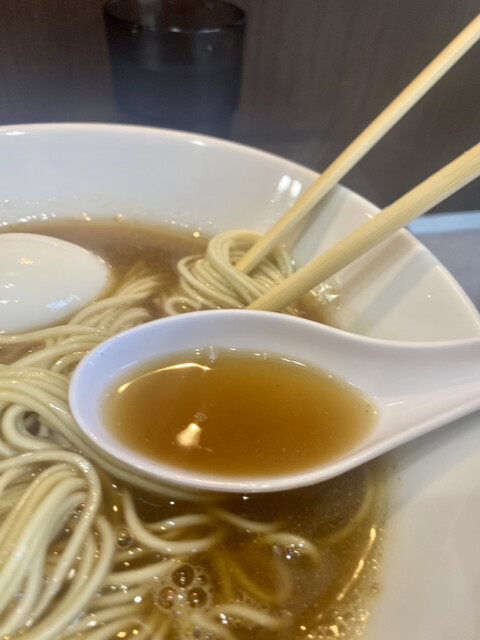 コチラ,定番の煮干しソバ(かけ)に,たまり醤油を入れ刻みニンニクをかけたラーメン、、、