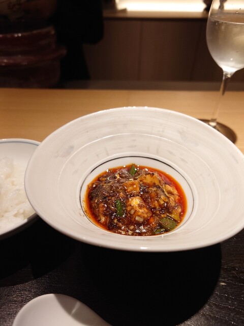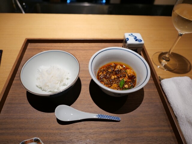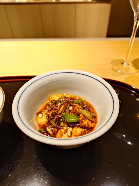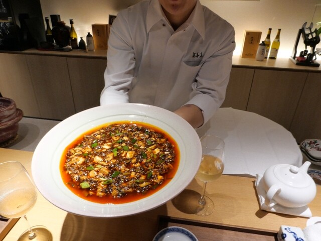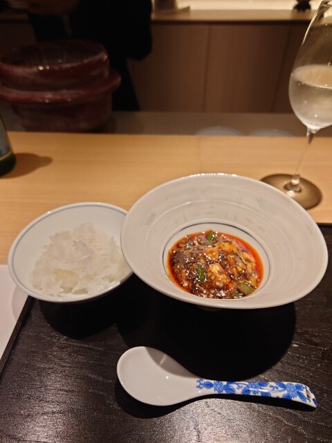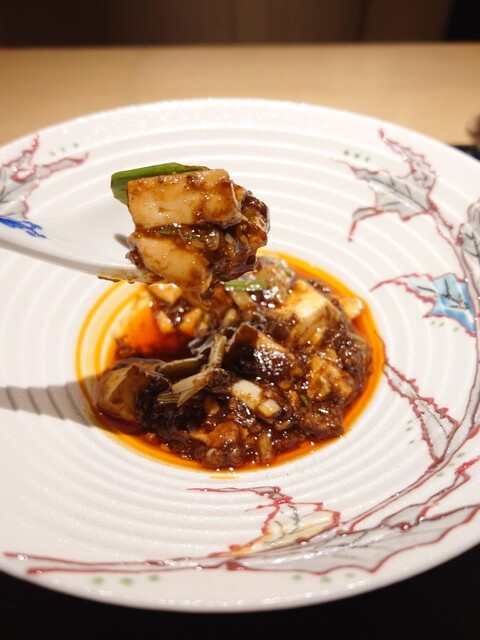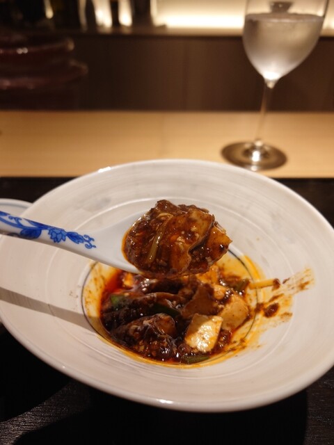 今回の料理はクラゲ、金目鯛、ボタン海老の中華風の雲丹ソースから始まり、三河欽宗鶏のピリ辛ソース、アワビと新筍のスープ、名残の上海蟹の春巻きにキャビアがかかったもの、宮崎牛のサーロインにドカッと黒トリュフをかけた物、毛鹿鮫のピリ辛のフカヒレ、金華ハムと干し貝柱だけを使ったスープと麺、そして最後は土釜ご飯と麻婆豆腐であった。