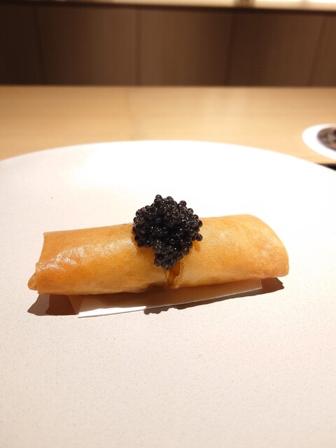 そしてここからは通常のコースに戻り、こちらの名物である春巻きがやってきた。中身は熊本産の銀杏である。そこに塩味のためのキャビアが乗せられており、このビジュアルだけでも食欲がそそられると言うものであった。これも美味しかったなあ~~