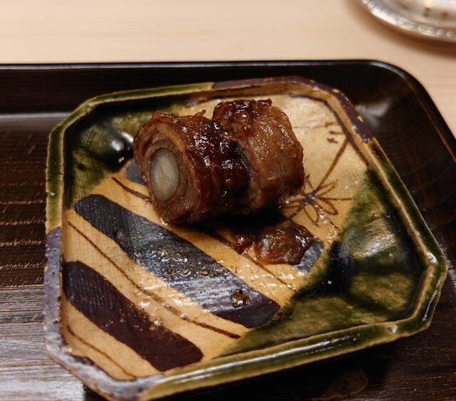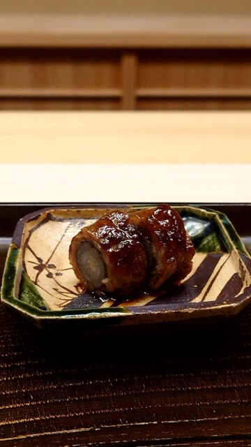 そして次は焼きものであった。氷見のクエを熟成させ表面には酒盗を塗り焼いたものらしい。身はしっかりとしているのに中はとても瑞々しい~~何これ??この食感??焼いた魚とは思得ないぐらいの美味しさであった。