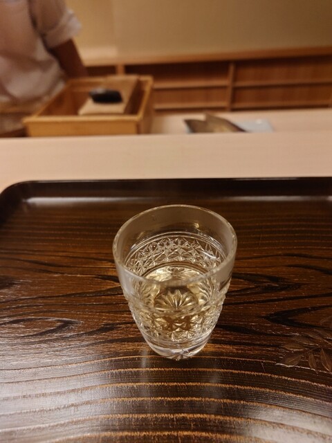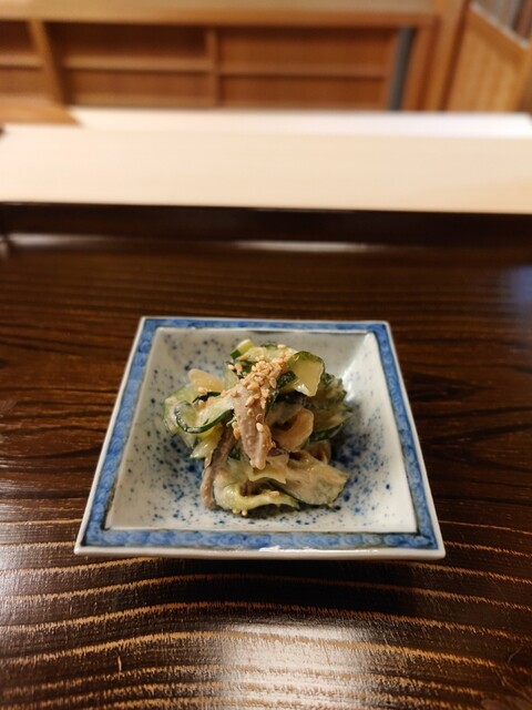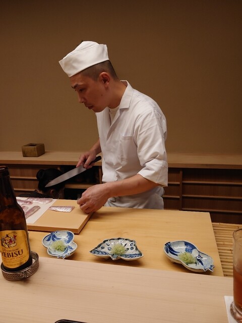 最初にお弟子さんがひときわ湯気の立つ青いおしぼりを持ってきてくれた。これはお手拭き用ではなく。首の後ろに当ててその温熱効果によりリラックスしてもらおうという店主の粋な計らいのようであった。何度も来ている友人によるとこれは毎回行うようである。
