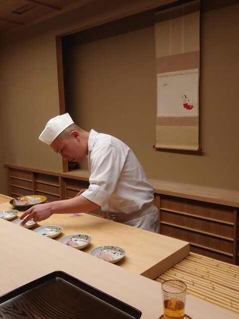 土地勘が全くないのでタクシーにてお店まで行き開店と同時に中に入れてもらった。当然のことではあるがこの日は7席すべてが満席であった。もうシンプル過ぎると思えるぐらいの店内には正面にお雛様の掛け軸が飾ってあるだけであとは何もない。そういう簡素な空間がこれから楽しめるであろう料理に対しての期待を嫌でも高めてくれるのである。