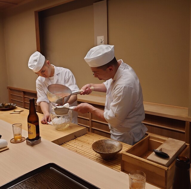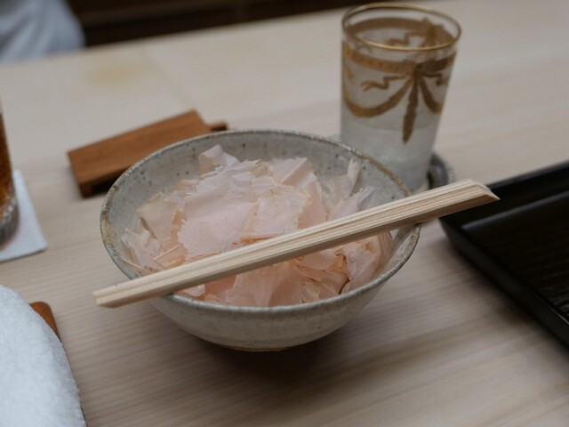 またお弟子さんが鰹節を削りそれに昆布出汁を合わせて大将が「片折の出汁」を作っていくのは見ていても楽しいものである。塩も何も入れない出汁のテイスティングにはいつも心躍るのである。