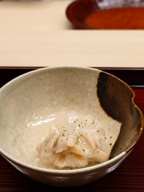 次は生のクチコの羽二重蒸しであった。玉締めとも言うらしい。簡単に言えば茶碗蒸しの中に生のクチコが入っておりこの1ヶ月ほどしか食べることができないようである。これも海の香りが何とも言えず器の中に能登の海を感じる一品であった。