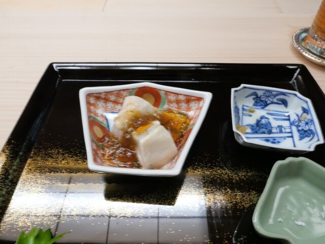 最初に出てきたのは春菊豆腐に焼いた春菊を乗せたものからであった。まずはいきなりパンチを喰らわされたぐらいの衝撃であった。私は春菊は嫌いではないがあの苦みをあまり感じることがないのだが香りと味はしっかりと春菊であった。春菊は鍋では定番の素材だがこんな食べ方があったとは!!これはいきなり凄いものが出てきた!!そんなスタートであった。