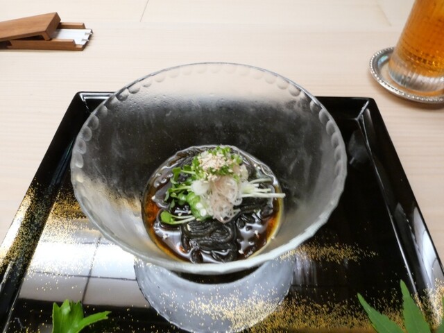 カジメという能登の海藻を使ったものである。昆布の仲間のようであるが、成長すると固くて食べることができないため今の時期しか食べることができないそうだ。なかなか一般には知られていない食材で流通もしていないそうだが、漁師さんとの個人的な関係で仕入れることができるとのことであった。