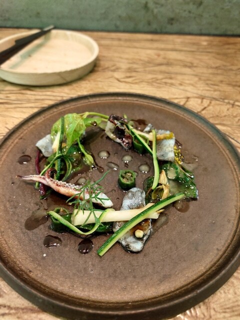 そして薄青いまるで海の波を連想させるような器に乗ってきたのはさっきまで生きていたというホタルイカであった。ちなみにこの器は富山県のガラス作家、小島有香子さんの作品だそうである。現代的な直線と曲線の美が料理を盛り立てる素晴らしい器であった。また私は元来ホタルイカはあまり好きではないのだが、先日訪れた片折で人生で初めて美味しいと思えたホタルイカを経験した。そしてまだそう日も経っていないこの日も、人生で2度目の美味しいホタルイカを食すことができたのである。ホタルイカのような繊細な食材は現地で食べないと美味しくないのだ、ということを身をもって知ることができた。大葉のオイルとハコベラで頂くホタルイカはもう最高としか言えない、そんな美味しいものであった。