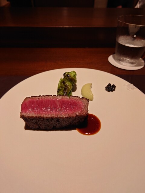 またメインのに牛肉は近江牛のサーロインかもしくは熊本牛のフィレの選択であったがわたしたちは近江牛のサーロインにさせて頂いた。これを最初は炭火でじっくりと火を入れ、その後後ろにある薪窯に入れて仕上げをするというととても手の込んだ料理であった。薪の香りをまとったサーロインは表面がカリッと、そして中がしっとりジューシーでおそらく今まで食べた肉の中では1,2を争うぐらいの美味しいものであった。東シェフの腕と街中には設置困難な薪焼き用の窯のなせる業なんだろうなあ~~