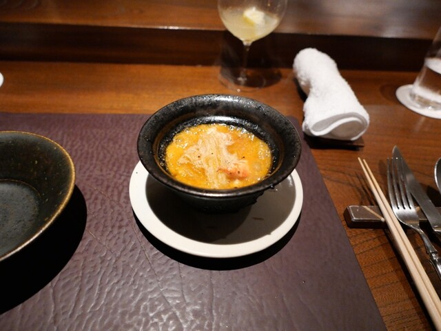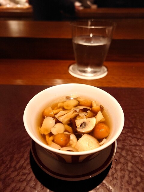 重厚な扉を開けて入ると右手には個室、そして左手奥には8名座れるカウンターがあり、今回はカウンターでの食事となった。もちろん個室も悪くはないがやはりこういう店ではシェフの手元が見ることができるカウンターの方が良いであろう。目で楽しみ舌で味わう・・私はそんな楽しみ方が好きなのである。