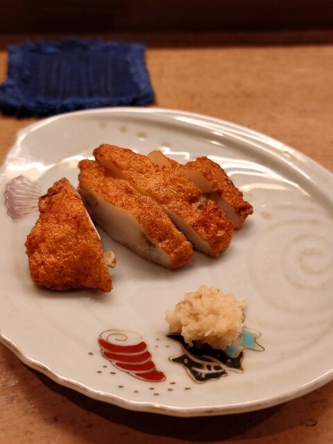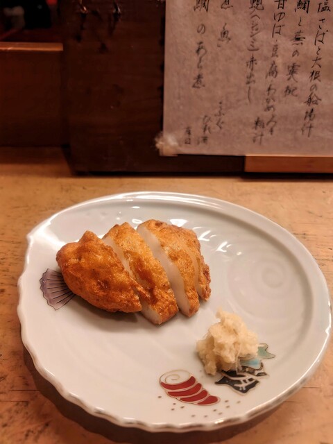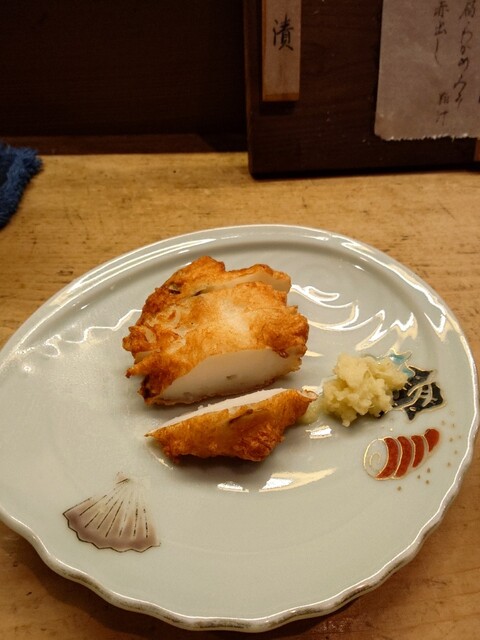 出汁巻き玉子もマストだし、干し芋とアオリイカの天ぷらはこれも大徳寺納豆の香りのする塩で頂くと絶妙なのだ。お刺身は提供直前に骨から外すというスゴ技を見せてくれるし、はんぺんはすり身から作ってくれる。