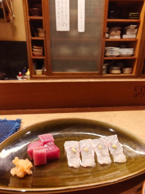 まずはお刺身から。鯛やこち、マグロなど、どれを頂くかは自分で決めることができる。盛り合わせもできるし単品でのオーダーも可能だ。最初は美味しそうな「鯛霜降り」といわしでお願いした。