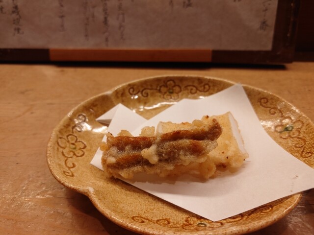 アオリイカと干し芋の天ぷらを大徳寺納豆の混ざった塩で頂くことははここでしかできない。何となく香る大徳寺納豆の風味が何とも言えないほどの味わいを天ぷらに与えているのである。