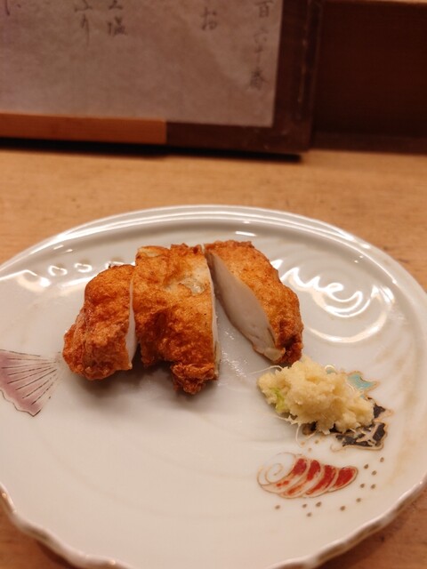 大将が目の前にいるので隣のグループの食べている物も作っているのも見えた。どうやらあちらは常連さんのようであったので参考にさせて頂くことにした。その中でも特にはんぺんはとても美味しそうであったのでオーダーした。はんぺんは練り物の形を整えるところから始まった。白いお餅のような魚のすり身を手で整え、それを油の中に入れて揚げるようであった。はんぺんを横目に大将は別の料理を作っていたが時々気にしていた。そこは奥様がかなりしっかりと目を配られていてきちんと管理されている。あうんの呼吸とはこういうことを言うのだろうか?