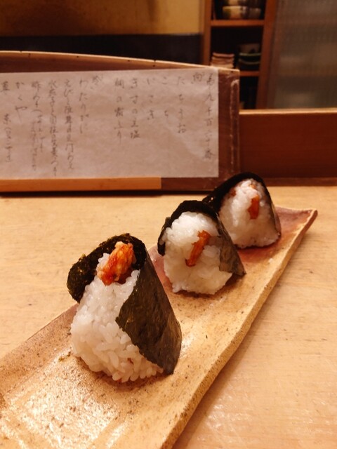 そしてここからが炭水化物祭りである。今回は私は諸事情により控えめに「宇宙一の天むす」は3個にしておいた。ちなみに宇宙一というのは店主がそう言っているわけではなく、客が美味しさのあまり勝手につけた名前なので誤解なきようお願いしたい。しかしそれほど美味しい天むすなのである。