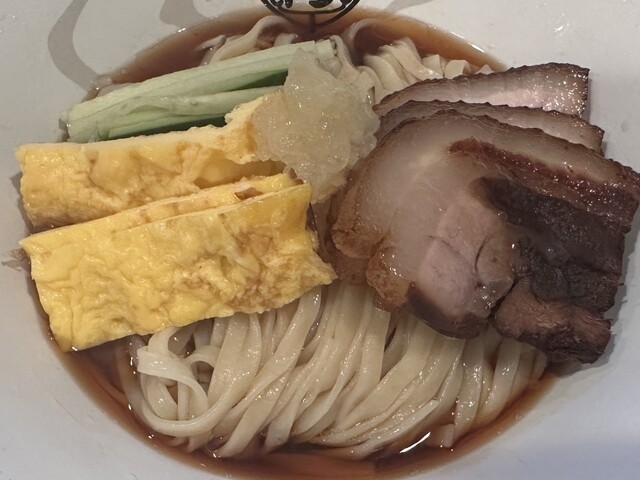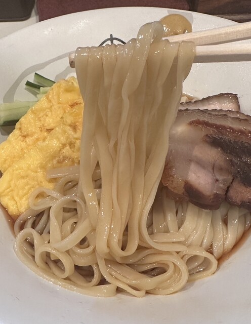ツルツルしなやかな平打ちぴろぴろ麺は、酸味控えめでほんのり甘い中華ダレにしっとりと浸り、その上には自家製玉子焼き、炙りチャーシュー、千切りきゅうり、そして日向夏ジュレが添えられたもの。