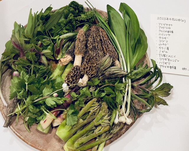 シェフの大きな手から生み出される繊細なお料理。じっくり手をかけらた山の恵みを薪火のスパイスとともに素敵な作家さんの器でいただくスタイル。