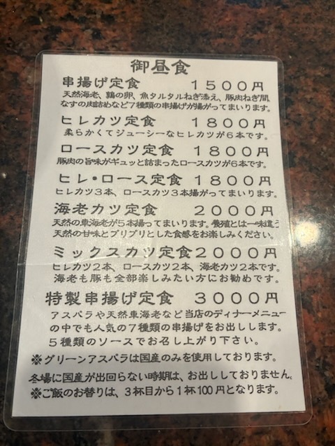 博多駅筑紫口のすぐ近くのお店で串揚げ定食(税込1,500円)を堪能。12時頃に訪問すると満席で、人気の高さに納得。店主が一人で揚げる串揚げは衣がサクサク、素材の旨味が油でしっかり閉じ込められ、口に入れた瞬間ほかほかでまるで蒸し料理のような食感。揚げたてを2~3本ずつ提供してくれるので、最後まで熱々を楽しめます。特製ソースが絶妙で、ごはんが止まらない美味しさ。小鉢や味噌汁も付いてこの価格は驚きのコスパ。落ち着いた店構えで、ランチタイムは早めの来店がおすすめ。最後に、漬物の切り方と盛り付けの美しさに感動。彩り豊かで器の中に小さな芸術を感じます。満足度の高い定食でした。