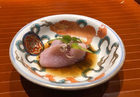 座付はお吸い物から。昆布と手羽先で出汁をとった澄まし仕立て。ねぎと湯がかれた蕾菜が入る。