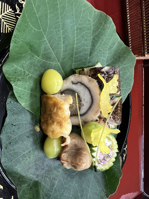 日本料理、でも余興があって華やか~お料理が平安貴族の蒔絵のようですね~