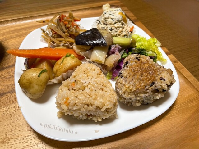 味噌焼きおにぎりと鶏五目おにぎりの2個と野菜たっぷりのデリが5種類、人参のポタージュもスープセットとして付けました。
