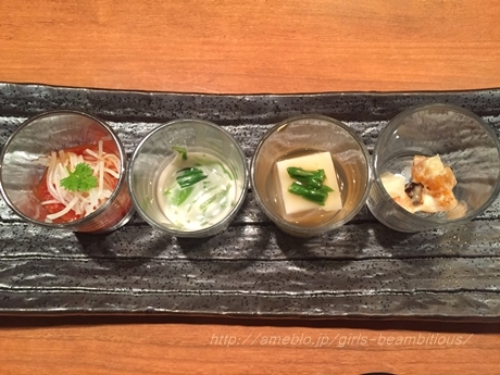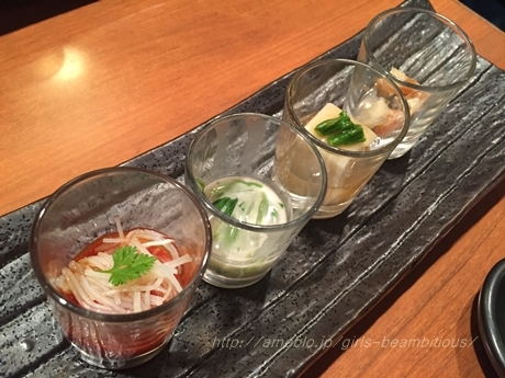▼前菜(大根・セロリ・小柱のコチュジャン和え、酒盗の豆腐、豆腐の細切り だしのせ)