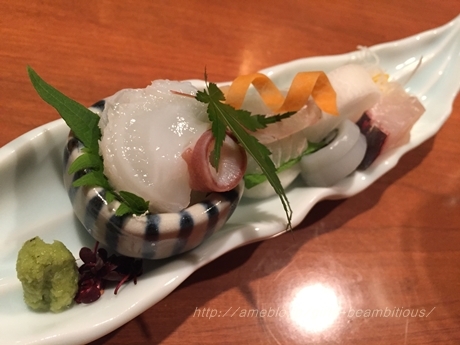 刺身盛り合わせ (水タコ、スズキ、縞鯵、アオリイカ)