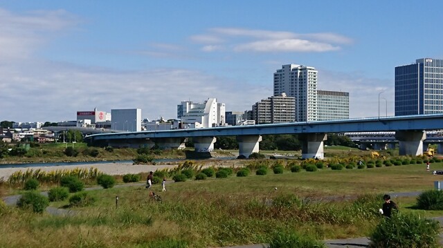 かすみ堤を多摩川へ ニコタマから東急電車が川を渡ってきます