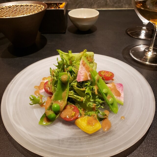 ただの箸休めでない生野菜。彩りも美しく、ドレッシングが凝っていて美味しいです。