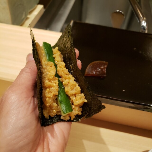 なんでも「鮨由う」で出しているプリン巻きの許可を貰い、こちらの店舗でも出しているとのこと。きっと、それほど食べて貰いたいと思われたのでしょうね。中心にキュウリが巻かれていて、一緒に出された西瓜の奈良漬けを噛りながら味わうと、なお乙です。