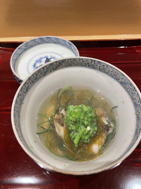 を、めくるとツブ貝、雲丹、じゅんさい、なんかのジュレ。ぷるっぷる&ツブ貝が超コリコリ!ぎゃぁぁぁ一生食ってたい