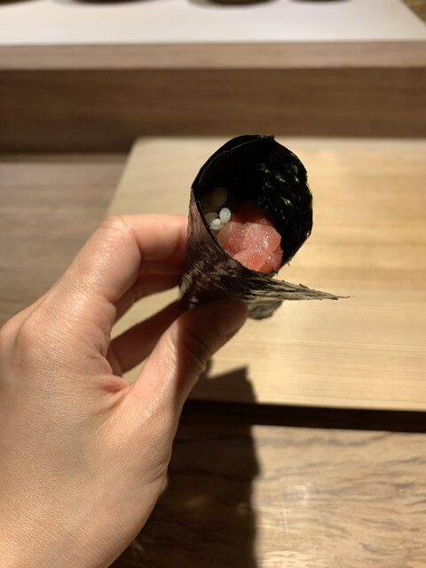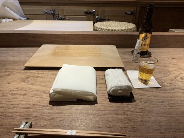 まっすぐカウンター6席のみ。後ろにソファー席がありますが荷物置きだそうです。お洒落〜!外の様子がわからはいのでなんだか異空間。大将始め皆さん若くて和気藹々、仲が良さそうなのが伝わってきます。きゅん。。そしてやはり神楽坂だし他のお客様もお上品な感じでいいわぁ。。