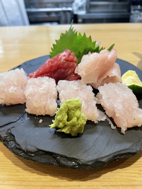 まだありました♡天然虎河豚!は鮟肝ポン酢で。鯨の尾の身(ウメー!)とイカは山葵醤油で。