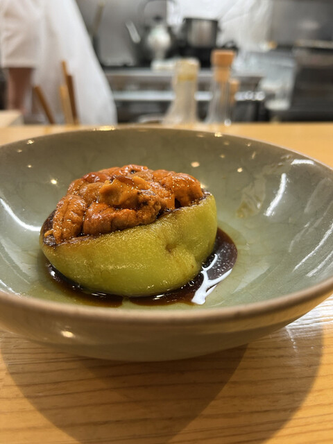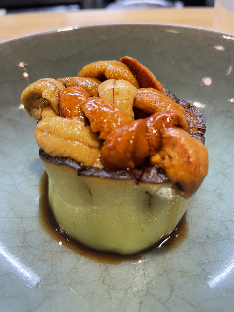 スペシャリテの雲丹on茄子♡今回は赤茄子だそう。