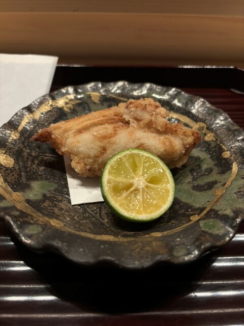 河豚の白子。焼いてるとこ見えちゃってテンション爆上がり!茶碗蒸しのことを玉…玉ナントカというらしい(やっぱ覚えらんない)ちっと山椒がきいてて、下のキクラゲと百合根がまたうみゃあ。百合根好き♡