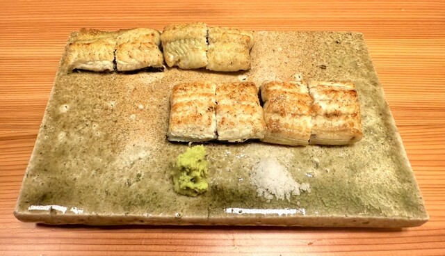 →3日寝かせた鰻と当日締めた鰻の蒲焼をお部屋の外で焼いた後、焼きたてを部屋内にて盛り付けし定期。焼いていると身のそり返り方も違いもよくわかる。鰻の味は寝かせた方はしっとりとして柔らかく、当日締めは鰻の身がしっかりとしていて共に絶品、旨い◎。今まで食べた鰻な中で間違いなくTOPの鰻。