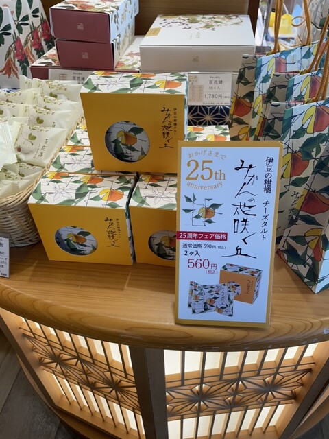 まんじゅうなど、美味しそうなお菓子がいろいろ売っており、迷いましたが、初心貫徹で「25周年フェア価格」の「伊豆の柑橘 チーズタルト」を購入しました。