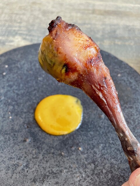 衝撃的な姿の若鶏のももを薪焼きしたものです。
